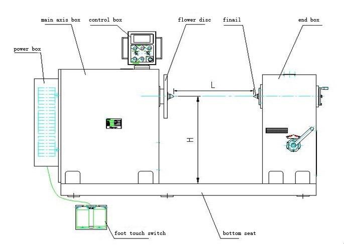 4, Design drawing: GRX coil winding machine compositionThis type horizontal coil winding machine is main composed of main axis box, end box, bottom seat, automatic winding and control part.