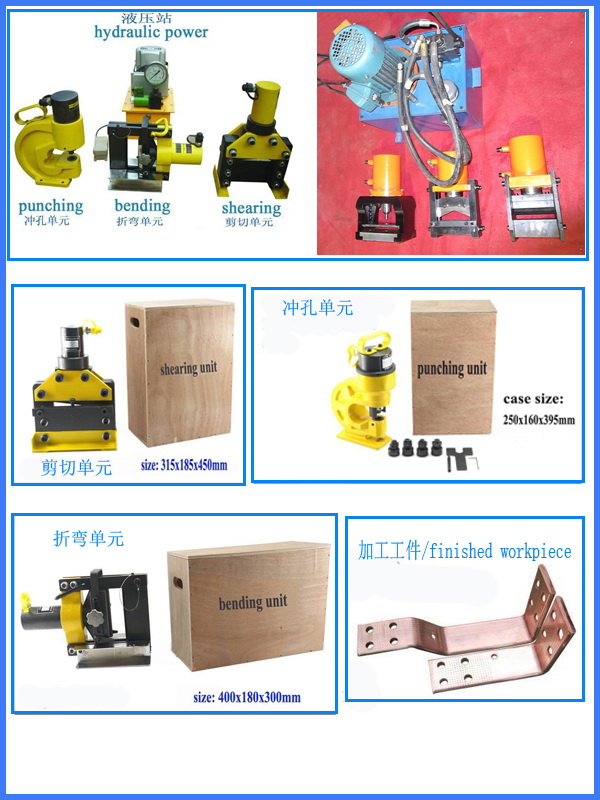 5, The Main characteristics:5-1, There is 3 working units of punching, shearing and bending. It can be used for busbar punching, shearing and bending work. Through adjust and change quick connecting head, the 3 working unit can shift quickly.