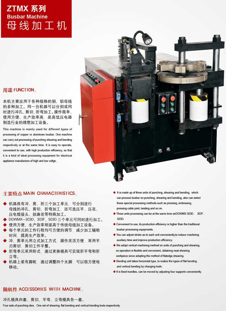 本系列母線加工機有沖、剪、折三個單元,每個加工單元的工作行程均可方便地調節(jié),縮短加工時間,提高生產效率。主要功能為加工不同規(guī)格的銅、鋁母線,只需用相應的加工單元,就能方便、快捷的對銅、鋁排進行剪切、沖孔(圓孔、長圓孔),折平彎、立彎、壓花等加工。通過更換模具還可完成壓平、扭麻花、壓電纜接頭,對銅棒進行切斷、壓扁、沖孔、折彎等特殊加工。